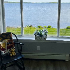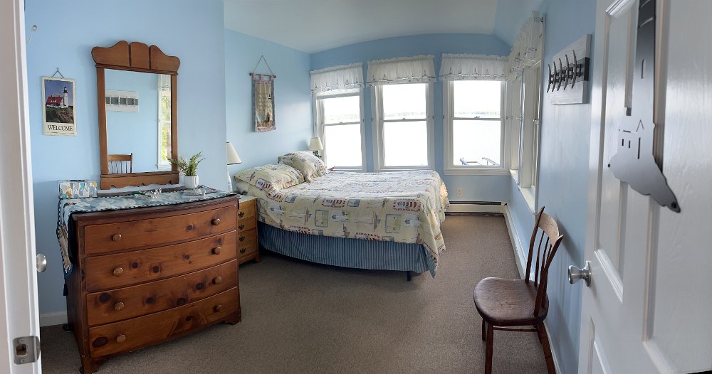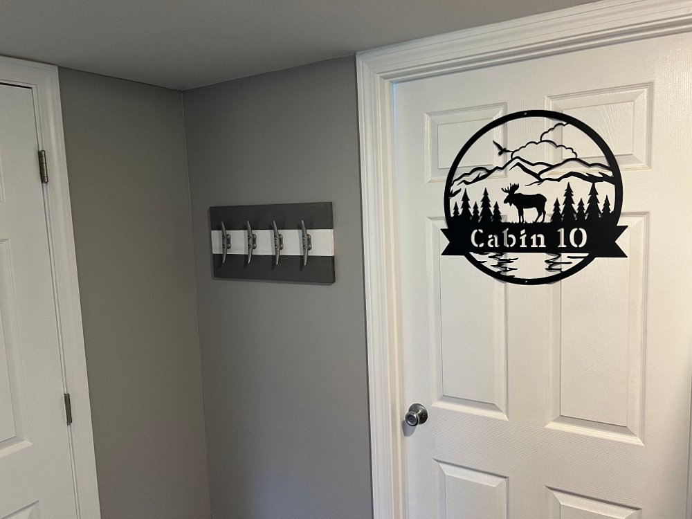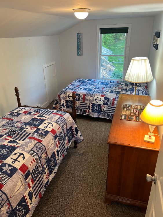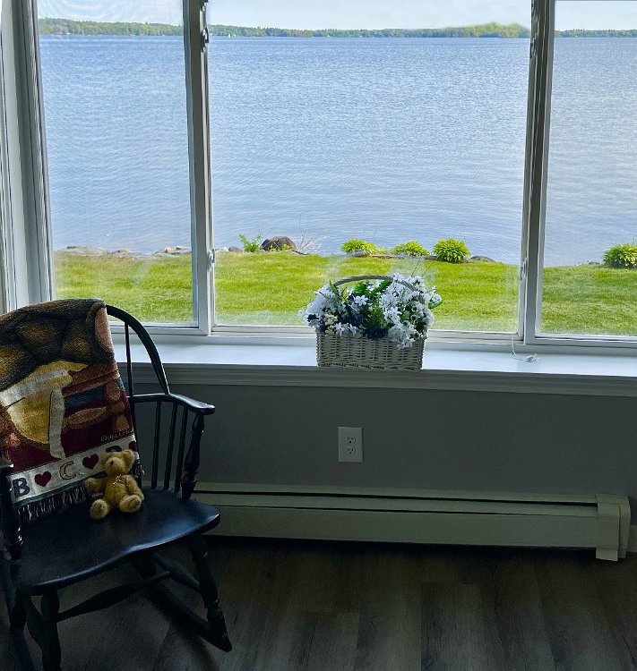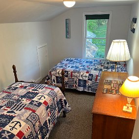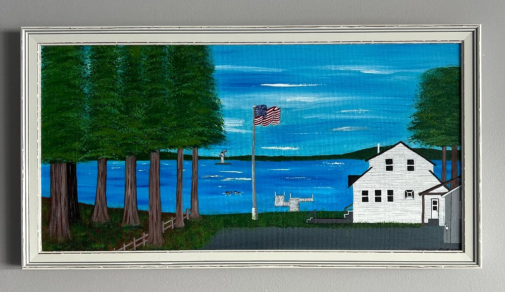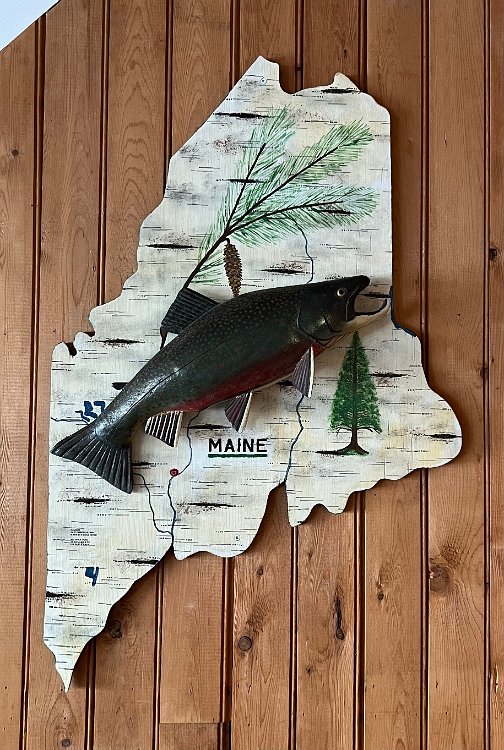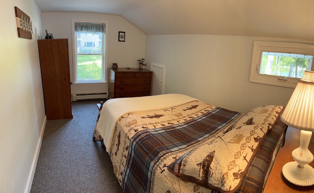 “Cabin 10” Entrance – upstairs front bedroom. “Cabin 10” Layout – 2 queen beds. “Gone Fishin” Entrance – upstairs bedroom. “Gone Fishin” Layout – 1 double bed. “Yacht Club” Layout – upstairs bedroom – 1 double and 1 twin. “Lighthouse Room” Entrance – Downstairs bedroom. “Lighthouse Room” Layout – 1 Double bed. Dining Room with view of kitchen to the right and den through the front windows. Dining room looking through the porch windows. Have a seat, enjoy the view, a hobby, a book. Large family room with plenty of seating and an incredible view down the lake. Artistic rendering of the Cobbossee Hideaway, painted by a family member. Wooden carving of a trophy trout caught by the then-owner of the camp. Family room at night is just as cozy. Bunk room offers six additional single beds according to the season. The Lake