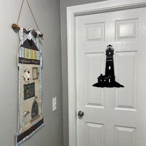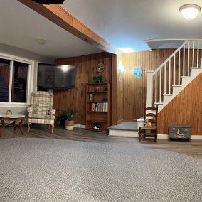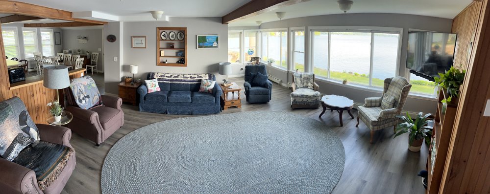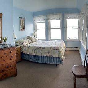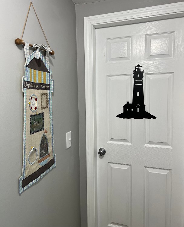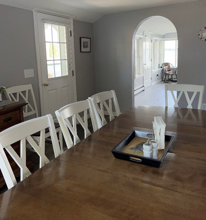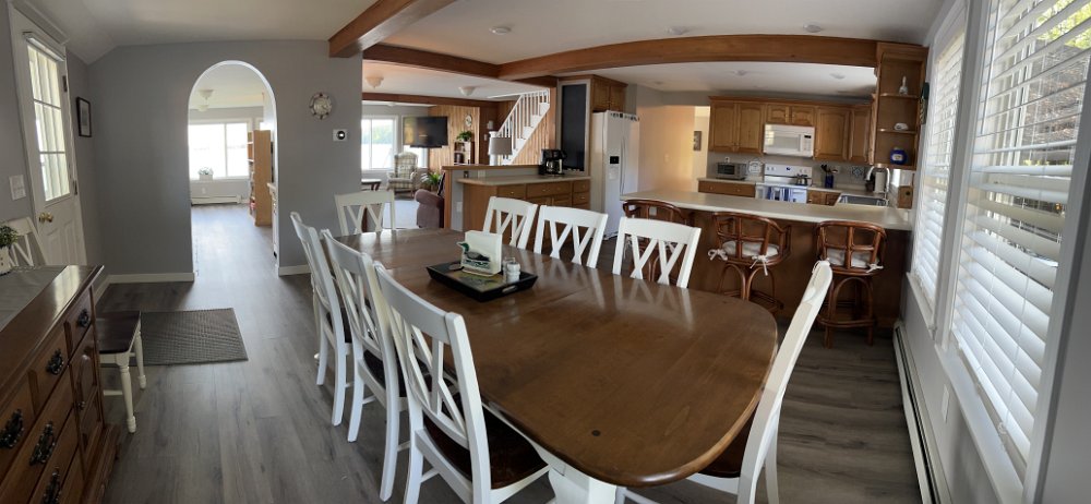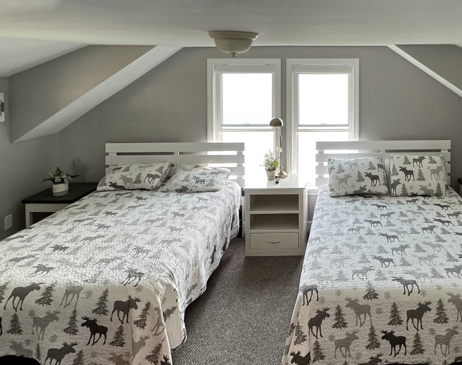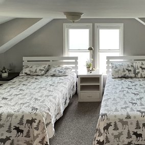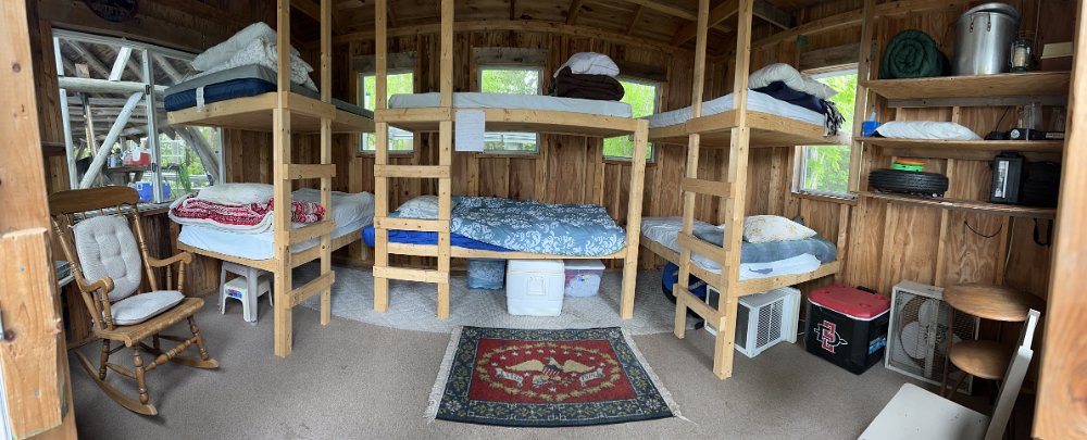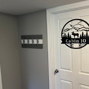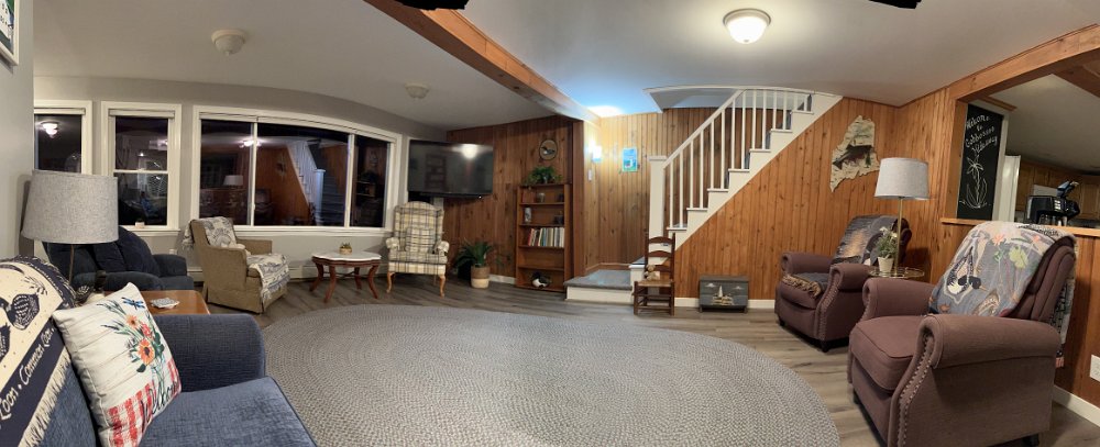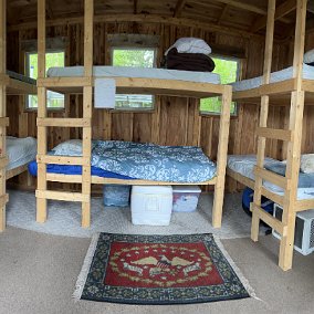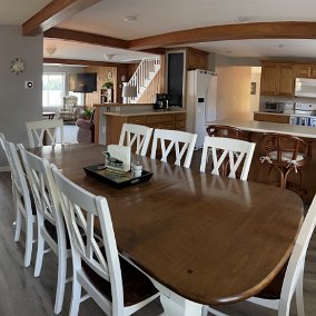 “Cabin 10” Entrance – upstairs front bedroom. “Cabin 10” Layout – 2 queen beds. “Gone Fishin” Entrance – upstairs bedroom. “Gone Fishin” Layout – 1 double bed. “Yacht Club” Layout – upstairs bedroom – 1 double and 1 twin. “Lighthouse Room” Entrance – Downstairs bedroom. “Lighthouse Room” Layout – 1 Double bed. Dining Room with view of kitchen to the right and den through the front windows. Dining room looking through the porch windows. Have a seat, enjoy the view, a hobby, a book. Large family room with plenty of seating and an incredible view down the lake. Artistic rendering of the Cobbossee Hideaway, painted by a family member. Wooden carving of a trophy trout caught by the then-owner of the camp. Family room at night is just as cozy. Bunk room offers six additional single beds according to the season. The Lake